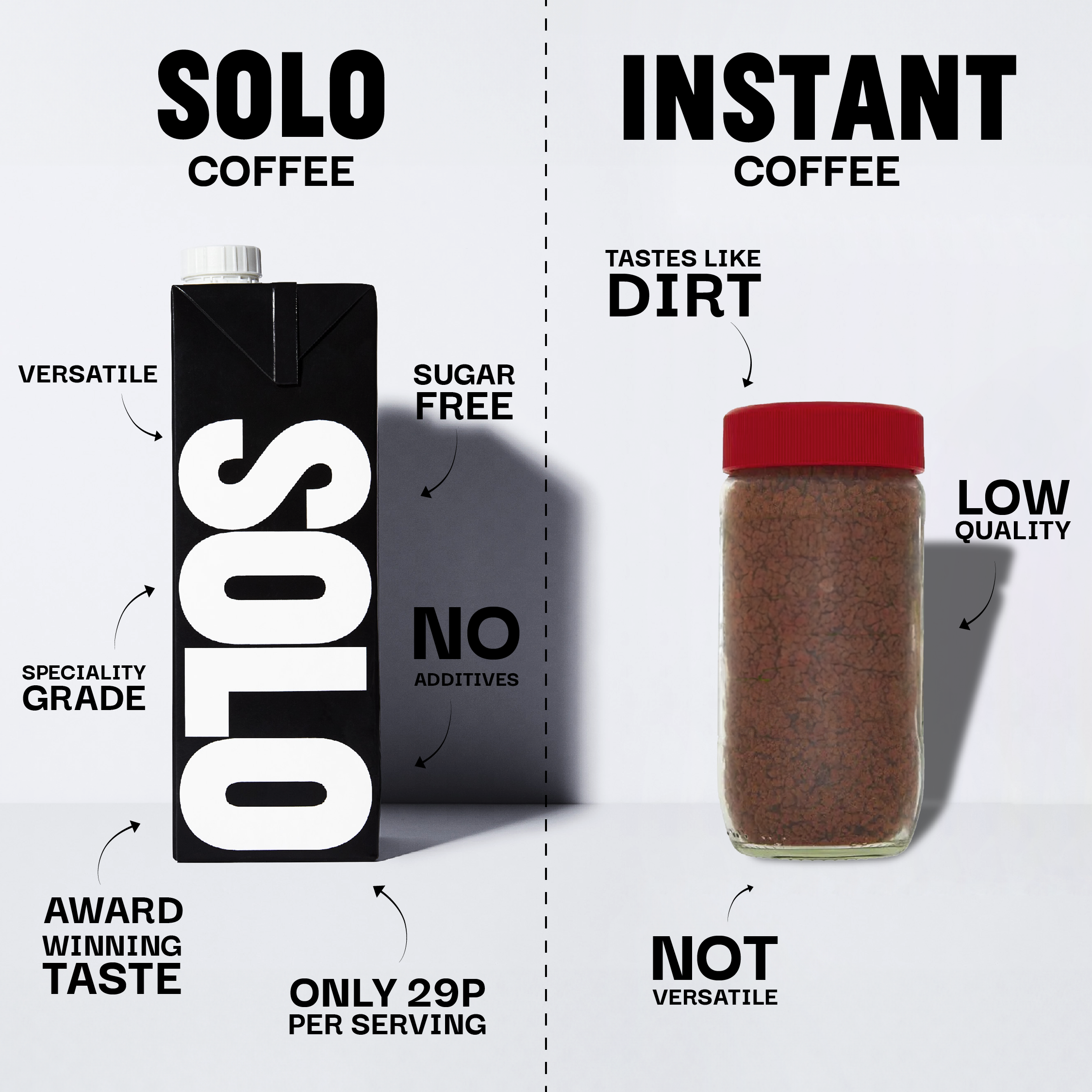 At SOLO, we only use beans graded 80+ (Very Good) or higher by The Specialty Coffee Association, a carefully sourced blend of Colombian and Brazilian coffees. No foaming agents, no preservatives, no sugar.